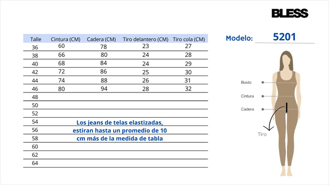 - Talles 36, 38, 40, 42, 44, 46