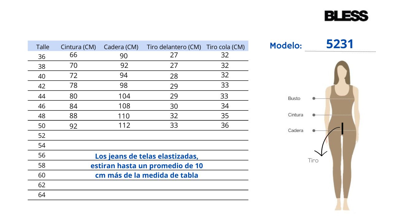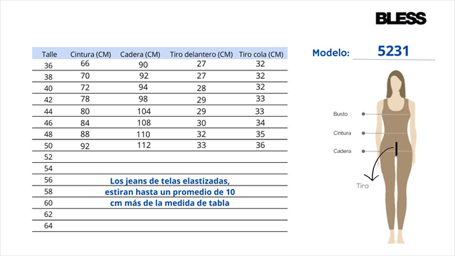 - Talles 36, 38, 40, 42, 44, 46